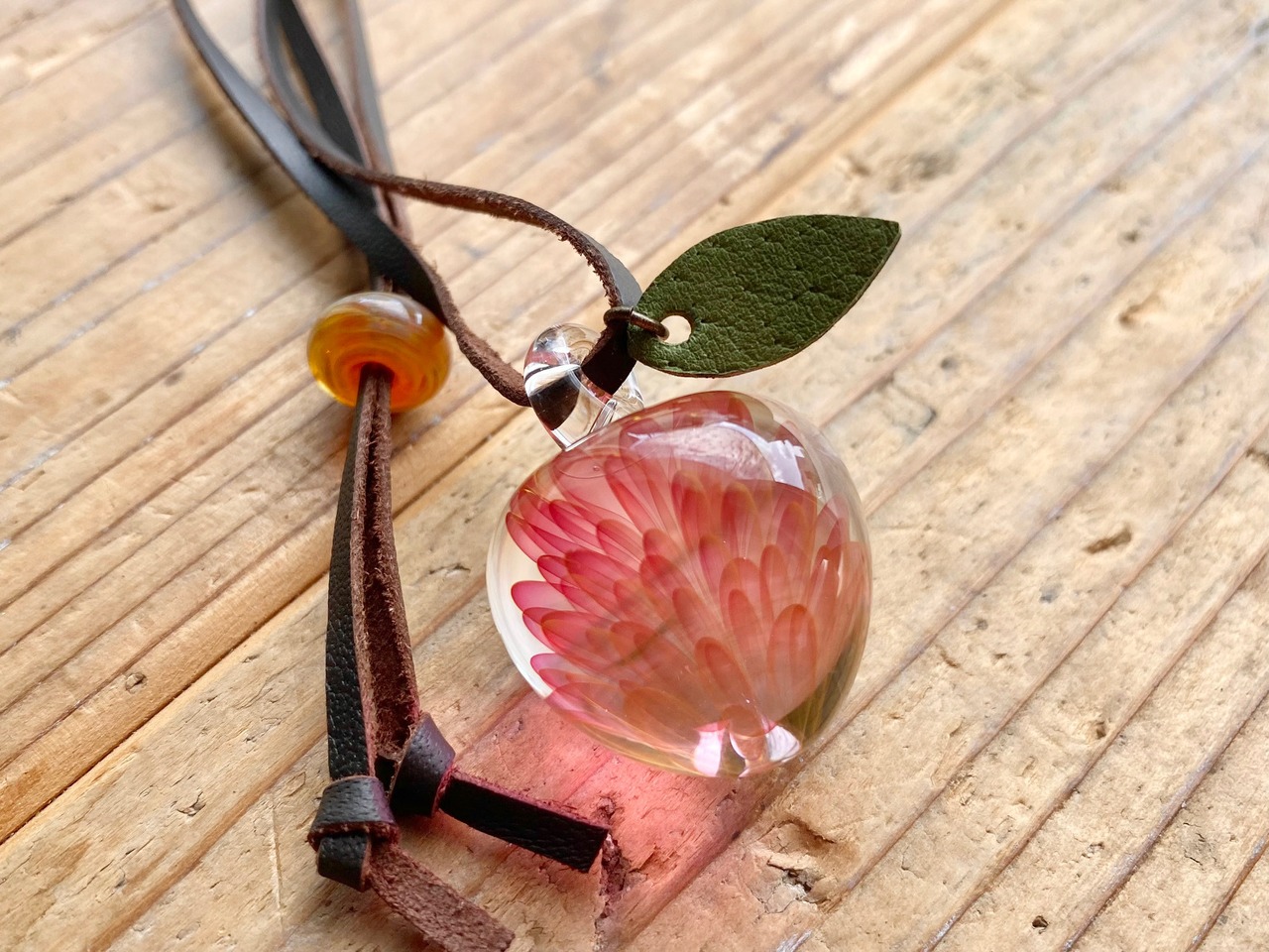 素材:ボロシリケイトガラス、革紐、ガラスビーズ他